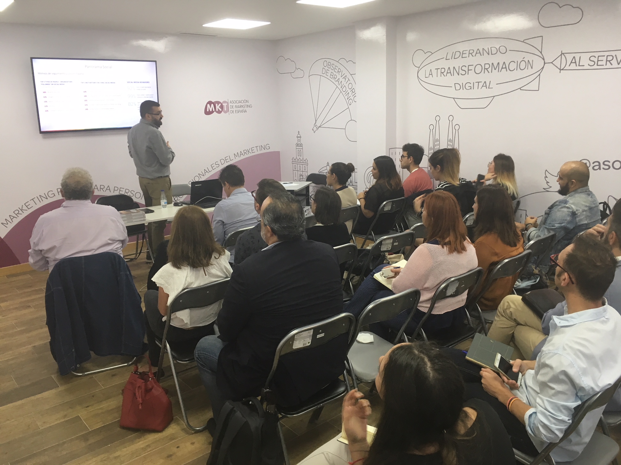 La nueva y espectacular sala multiusos de la Asociación de Marketing de España (MKT) acogió la presentación, seguida de preguntas de los asistentes. Eugenio, profesional que comenzó su carrera en como redactor creativo en agencias off line, alguna tan conocida como Contrapunto, viró su carrera hacia lo digital hace años y especialmente los últimos hacia el mundo de los medios sociales.